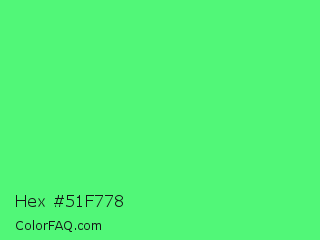 Hex #51f778 Color is a light green color and the nearest color is Very Light Malachite Green #64e986. Hex code #51f778 and RGB value is rgb(81,247,120). In RGB color space, this color is composed of 32% red, 97% green, 47% blue, In CMYK color space, this color is composed of 67% cyan, 0% magenta, 51% yellow , 3% black , In HSL color space, this color has a hue angle of 134° , 91% saturation and 64% lightness.
