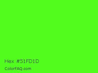 Hex #51fd1d Color is a normal green color and the nearest color is Neon Green #39ff14. Hex code #51fd1d and RGB value is rgb(81,253,29). In RGB color space, this color is composed of 32% red, 99% green, 11% blue, In CMYK color space, this color is composed of 68% cyan, 0% magenta, 89% yellow , 1% black , In HSL color space, this color has a hue angle of 106° , 98% saturation and 55% lightness.