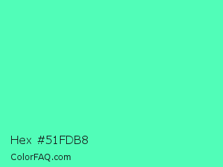 Hex #51fdb8 Color is a light green color and the nearest color is Medium Aquamarine #66ddaa. Hex code #51fdb8 and RGB value is rgb(81,253,184). In RGB color space, this color is composed of 32% red, 99% green, 72% blue, In CMYK color space, this color is composed of 68% cyan, 0% magenta, 27% yellow , 1% black , In HSL color space, this color has a hue angle of 156° , 98% saturation and 65% lightness.