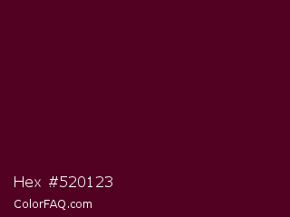Hex #520123 Color is a very dark rose color and the nearest color is Castro #52001f. Hex code #520123 and RGB value is rgb(82,1,35). In RGB color space, this color is composed of 32% red, 0% green, 14% blue, In CMYK color space, this color is composed of 0% cyan, 99% magenta, 57% yellow , 68% black , In HSL color space, this color has a hue angle of 335° , 98% saturation and 16% lightness.