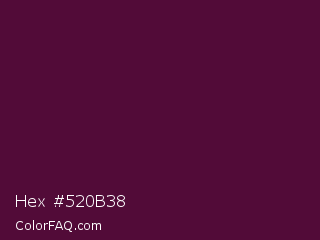 Hex #520b38 Color is a very dark magenta color and the nearest color is Blackberry #4d0135. Hex code #520b38 and RGB value is rgb(82,11,56). In RGB color space, this color is composed of 32% red, 4% green, 22% blue, In CMYK color space, this color is composed of 0% cyan, 87% magenta, 32% yellow , 68% black , In HSL color space, this color has a hue angle of 322° , 76% saturation and 18% lightness.