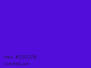 Hex #520ddb Color is a normal indigo color and the nearest color is Interdimensional Blue #360ccc. Hex code #520ddb and RGB value is rgb(82,13,219). In RGB color space, this color is composed of 32% red, 5% green, 86% blue, In CMYK color space, this color is composed of 63% cyan, 94% magenta, 0% yellow , 14% black , In HSL color space, this color has a hue angle of 260° , 89% saturation and 45% lightness.