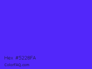 Hex #5228fa Color is a normal indigo color and the nearest color is Han Purple #5218fa. Hex code #5228fa and RGB value is rgb(82,40,250). In RGB color space, this color is composed of 32% red, 16% green, 98% blue, In CMYK color space, this color is composed of 67% cyan, 84% magenta, 0% yellow , 2% black , In HSL color space, this color has a hue angle of 252° , 95% saturation and 57% lightness.