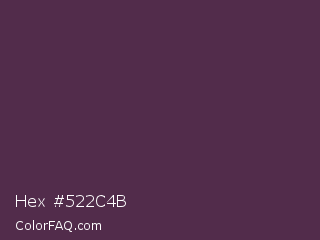Hex #522c4b Color is a dark magenta color and the nearest color is Voodoo #533455. Hex code #522c4b and RGB value is rgb(82,44,75). In RGB color space, this color is composed of 32% red, 17% green, 29% blue, In CMYK color space, this color is composed of 0% cyan, 46% magenta, 9% yellow , 68% black , In HSL color space, this color has a hue angle of 311° , 30% saturation and 25% lightness.