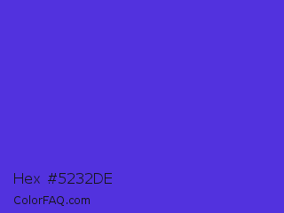 Hex #5232de Color is a normal indigo color and the nearest color is Majorelle Blue #6050dc. Hex code #5232de and RGB value is rgb(82,50,222). In RGB color space, this color is composed of 32% red, 20% green, 87% blue, In CMYK color space, this color is composed of 63% cyan, 77% magenta, 0% yellow , 13% black , In HSL color space, this color has a hue angle of 251° , 72% saturation and 53% lightness.