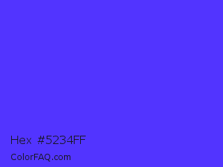 Hex #5234ff Color is a normal indigo color and the nearest color is Han Purple #5218fa. Hex code #5234ff and RGB value is rgb(82,52,255). In RGB color space, this color is composed of 32% red, 20% green, 100% blue, In CMYK color space, this color is composed of 68% cyan, 80% magenta, 0% yellow , 0% black , In HSL color space, this color has a hue angle of 249° , 100% saturation and 60% lightness.