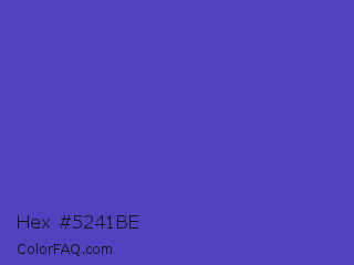 Hex #5241be Color is a normal indigo color and the nearest color is Ocean Blue #4f42b5. Hex code #5241be and RGB value is rgb(82,65,190). In RGB color space, this color is composed of 32% red, 25% green, 75% blue, In CMYK color space, this color is composed of 57% cyan, 66% magenta, 0% yellow , 25% black , In HSL color space, this color has a hue angle of 248° , 49% saturation and 50% lightness.