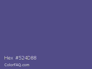 Hex #524d88 Color is a normal indigo color and the nearest color is Purple Navy #4e5180. Hex code #524d88 and RGB value is rgb(82,77,136). In RGB color space, this color is composed of 32% red, 30% green, 53% blue, In CMYK color space, this color is composed of 40% cyan, 43% magenta, 0% yellow , 47% black , In HSL color space, this color has a hue angle of 245° , 28% saturation and 42% lightness.
