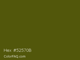 Hex #52570b Color is a very dark yellow color and the nearest color is Saratoga #555b10. Hex code #52570b and RGB value is rgb(82,87,11). In RGB color space, this color is composed of 32% red, 34% green, 4% blue, In CMYK color space, this color is composed of 6% cyan, 0% magenta, 87% yellow , 66% black , In HSL color space, this color has a hue angle of 64° , 78% saturation and 19% lightness.