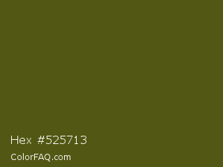 Hex #525713 Color is a very dark yellow color and the nearest color is Saratoga #555b10. Hex code #525713 and RGB value is rgb(82,87,19). In RGB color space, this color is composed of 32% red, 34% green, 7% blue, In CMYK color space, this color is composed of 6% cyan, 0% magenta, 78% yellow , 66% black , In HSL color space, this color has a hue angle of 64° , 64% saturation and 21% lightness.