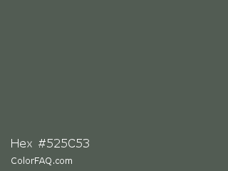 Hex #525c53 Color is a normal green color and the nearest color is Ebony #555d50. Hex code #525c53 and RGB value is rgb(82,92,83). In RGB color space, this color is composed of 32% red, 36% green, 33% blue, In CMYK color space, this color is composed of 11% cyan, 0% magenta, 10% yellow , 64% black , In HSL color space, this color has a hue angle of 126° , 6% saturation and 34% lightness.