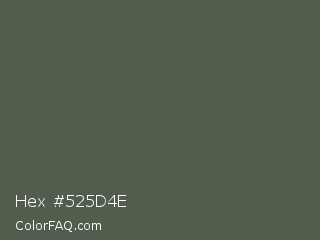 Hex #525d4e Color is a normal green color and the nearest color is Ebony #555d50. Hex code #525d4e and RGB value is rgb(82,93,78). In RGB color space, this color is composed of 32% red, 36% green, 31% blue, In CMYK color space, this color is composed of 12% cyan, 0% magenta, 16% yellow , 64% black , In HSL color space, this color has a hue angle of 104° , 9% saturation and 34% lightness.