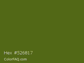 Hex #526817 Color is a dark lime color and the nearest color is Saratoga #555b10. Hex code #526817 and RGB value is rgb(82,104,23). In RGB color space, this color is composed of 32% red, 41% green, 9% blue, In CMYK color space, this color is composed of 21% cyan, 0% magenta, 78% yellow , 59% black , In HSL color space, this color has a hue angle of 76° , 64% saturation and 25% lightness.