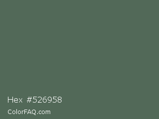 Hex #526958 Color is a normal green color and the nearest color is Finlandia #556d56. Hex code #526958 and RGB value is rgb(82,105,88). In RGB color space, this color is composed of 32% red, 41% green, 35% blue, In CMYK color space, this color is composed of 22% cyan, 0% magenta, 16% yellow , 59% black , In HSL color space, this color has a hue angle of 136° , 12% saturation and 37% lightness.