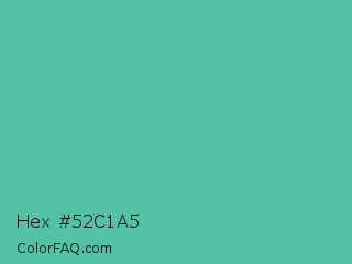Hex #52c1a5 Color is a normal cyan color and the nearest color is Puerto Rico #3fc1aa. Hex code #52c1a5 and RGB value is rgb(82,193,165). In RGB color space, this color is composed of 32% red, 76% green, 65% blue, In CMYK color space, this color is composed of 58% cyan, 0% magenta, 15% yellow , 24% black , In HSL color space, this color has a hue angle of 165° , 47% saturation and 54% lightness.