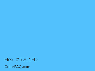 Hex #52c1fd Color is a light blue color and the nearest color is Blue Jeans #5dadec. Hex code #52c1fd and RGB value is rgb(82,193,253). In RGB color space, this color is composed of 32% red, 76% green, 99% blue, In CMYK color space, this color is composed of 68% cyan, 24% magenta, 0% yellow , 1% black , In HSL color space, this color has a hue angle of 201° , 98% saturation and 66% lightness.