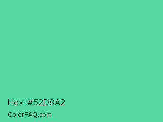 Hex #52d8a2 Color is a normal green color and the nearest color is Eucalyptus #44d7a8. Hex code #52d8a2 and RGB value is rgb(82,216,162). In RGB color space, this color is composed of 32% red, 85% green, 64% blue, In CMYK color space, this color is composed of 62% cyan, 0% magenta, 25% yellow , 15% black , In HSL color space, this color has a hue angle of 156° , 63% saturation and 58% lightness.
