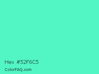 Hex #52f6c5 Color is a light green color and the nearest color is Turquoise #40e0d0. Hex code #52f6c5 and RGB value is rgb(82,246,197). In RGB color space, this color is composed of 32% red, 96% green, 77% blue, In CMYK color space, this color is composed of 67% cyan, 0% magenta, 20% yellow , 4% black , In HSL color space, this color has a hue angle of 162° , 90% saturation and 64% lightness.