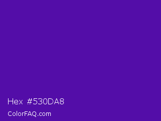Hex #530da8 Color is a normal violet color and the nearest color is Purple #660099. Hex code #530da8 and RGB value is rgb(83,13,168). In RGB color space, this color is composed of 33% red, 5% green, 66% blue, In CMYK color space, this color is composed of 51% cyan, 92% magenta, 0% yellow , 34% black , In HSL color space, this color has a hue angle of 267° , 86% saturation and 35% lightness.