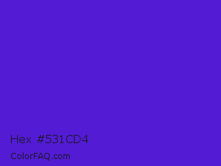 Hex #531cd4 Color is a normal indigo color and the nearest color is Purple Heart Crayola #652dc1. Hex code #531cd4 and RGB value is rgb(83,28,212). In RGB color space, this color is composed of 33% red, 11% green, 83% blue, In CMYK color space, this color is composed of 61% cyan, 87% magenta, 0% yellow , 17% black , In HSL color space, this color has a hue angle of 258° , 77% saturation and 47% lightness.
