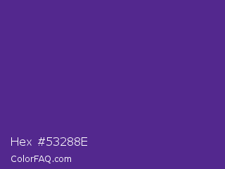 Hex #53288e Color is a normal violet color and the nearest color is KSU Purple #512888. Hex code #53288e and RGB value is rgb(83,40,142). In RGB color space, this color is composed of 33% red, 16% green, 56% blue, In CMYK color space, this color is composed of 42% cyan, 72% magenta, 0% yellow , 44% black , In HSL color space, this color has a hue angle of 265° , 56% saturation and 36% lightness.