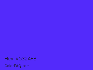 Hex #532afb Color is a normal indigo color and the nearest color is Han Purple #5218fa. Hex code #532afb and RGB value is rgb(83,42,251). In RGB color space, this color is composed of 33% red, 16% green, 98% blue, In CMYK color space, this color is composed of 67% cyan, 83% magenta, 0% yellow , 2% black , In HSL color space, this color has a hue angle of 252° , 96% saturation and 57% lightness.