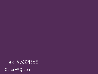 Hex #532b58 Color is a dark magenta color and the nearest color is Bossanova #4e2a5a. Hex code #532b58 and RGB value is rgb(83,43,88). In RGB color space, this color is composed of 33% red, 17% green, 35% blue, In CMYK color space, this color is composed of 6% cyan, 51% magenta, 0% yellow , 65% black , In HSL color space, this color has a hue angle of 293° , 34% saturation and 26% lightness.