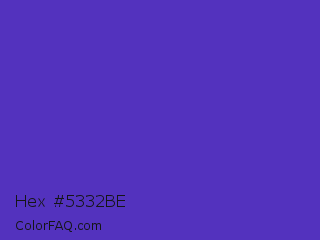 Hex #5332be Color is a normal indigo color and the nearest color is Ocean Blue #4f42b5. Hex code #5332be and RGB value is rgb(83,50,190). In RGB color space, this color is composed of 33% red, 20% green, 75% blue, In CMYK color space, this color is composed of 56% cyan, 74% magenta, 0% yellow , 25% black , In HSL color space, this color has a hue angle of 254° , 58% saturation and 47% lightness.