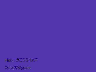 Hex #5334af Color is a normal indigo color and the nearest color is Ocean Blue #4f42b5. Hex code #5334af and RGB value is rgb(83,52,175). In RGB color space, this color is composed of 33% red, 20% green, 69% blue, In CMYK color space, this color is composed of 53% cyan, 70% magenta, 0% yellow , 31% black , In HSL color space, this color has a hue angle of 255° , 54% saturation and 45% lightness.