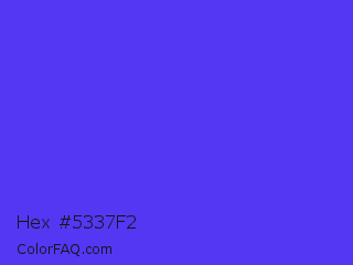 Hex #5337f2 Color is a normal indigo color and the nearest color is Han Purple #5218fa. Hex code #5337f2 and RGB value is rgb(83,55,242). In RGB color space, this color is composed of 33% red, 22% green, 95% blue, In CMYK color space, this color is composed of 66% cyan, 77% magenta, 0% yellow , 5% black , In HSL color space, this color has a hue angle of 249° , 88% saturation and 58% lightness.
