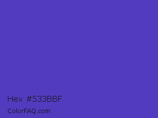 Hex #533bbf Color is a normal indigo color and the nearest color is Ocean Blue #4f42b5. Hex code #533bbf and RGB value is rgb(83,59,191). In RGB color space, this color is composed of 33% red, 23% green, 75% blue, In CMYK color space, this color is composed of 57% cyan, 69% magenta, 0% yellow , 25% black , In HSL color space, this color has a hue angle of 251° , 53% saturation and 49% lightness.