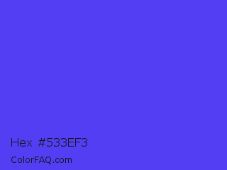 Hex #533ef3 Color is a normal indigo color and the nearest color is Majorelle Blue #6050dc. Hex code #533ef3 and RGB value is rgb(83,62,243). In RGB color space, this color is composed of 33% red, 24% green, 95% blue, In CMYK color space, this color is composed of 66% cyan, 74% magenta, 0% yellow , 5% black , In HSL color space, this color has a hue angle of 247° , 88% saturation and 60% lightness.