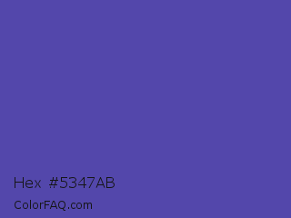 Hex #5347ab Color is a normal indigo color and the nearest color is Plump Purple #5946b2. Hex code #5347ab and RGB value is rgb(83,71,171). In RGB color space, this color is composed of 33% red, 28% green, 67% blue, In CMYK color space, this color is composed of 51% cyan, 58% magenta, 0% yellow , 33% black , In HSL color space, this color has a hue angle of 247° , 41% saturation and 47% lightness.
