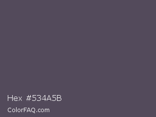 Hex #534a5b Color is a normal purple color and the nearest color is Trout #4a4e5a. Hex code #534a5b and RGB value is rgb(83,74,91). In RGB color space, this color is composed of 33% red, 29% green, 36% blue, In CMYK color space, this color is composed of 9% cyan, 19% magenta, 0% yellow , 64% black , In HSL color space, this color has a hue angle of 272° , 10% saturation and 32% lightness.