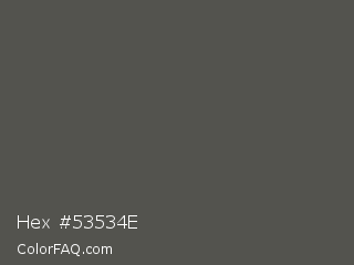 Hex #53534e Color is a normal yellow color and the nearest color is Fuscous Gray #54534d. Hex code #53534e and RGB value is rgb(83,83,78). In RGB color space, this color is composed of 33% red, 33% green, 31% blue, In CMYK color space, this color is composed of 0% cyan, 0% magenta, 6% yellow , 67% black , In HSL color space, this color has a hue angle of 60° , 3% saturation and 32% lightness.