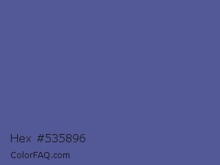 Hex #535896 Color is a normal blue color and the nearest color is UCLA Blue #536895. Hex code #535896 and RGB value is rgb(83,88,150). In RGB color space, this color is composed of 33% red, 35% green, 59% blue, In CMYK color space, this color is composed of 45% cyan, 41% magenta, 0% yellow , 41% black , In HSL color space, this color has a hue angle of 236° , 29% saturation and 46% lightness.