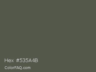Hex #535a4b Color is a normal green color and the nearest color is Ebony #555d50. Hex code #535a4b and RGB value is rgb(83,90,75). In RGB color space, this color is composed of 33% red, 35% green, 29% blue, In CMYK color space, this color is composed of 8% cyan, 0% magenta, 17% yellow , 65% black , In HSL color space, this color has a hue angle of 88° , 9% saturation and 32% lightness.