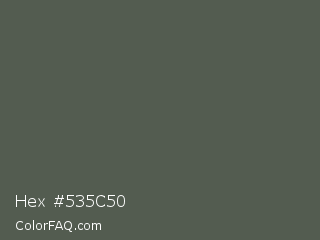 Hex #535c50 Color is a normal green color and the nearest color is Ebony #555d50. Hex code #535c50 and RGB value is rgb(83,92,80). In RGB color space, this color is composed of 33% red, 36% green, 31% blue, In CMYK color space, this color is composed of 10% cyan, 0% magenta, 13% yellow , 64% black , In HSL color space, this color has a hue angle of 105° , 7% saturation and 34% lightness.