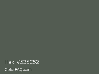 Hex #535c52 Color is a normal green color and the nearest color is Ebony #555d50. Hex code #535c52 and RGB value is rgb(83,92,82). In RGB color space, this color is composed of 33% red, 36% green, 32% blue, In CMYK color space, this color is composed of 10% cyan, 0% magenta, 11% yellow , 64% black , In HSL color space, this color has a hue angle of 114° , 6% saturation and 34% lightness.