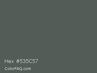Hex #535c57 Color is a normal green color and the nearest color is Feldgrau #4d5d53. Hex code #535c57 and RGB value is rgb(83,92,87). In RGB color space, this color is composed of 33% red, 36% green, 34% blue, In CMYK color space, this color is composed of 10% cyan, 0% magenta, 5% yellow , 64% black , In HSL color space, this color has a hue angle of 147° , 5% saturation and 34% lightness.
