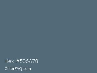 Hex #536a78 Color is a normal blue color and the nearest color is Paynes Grey #536878. Hex code #536a78 and RGB value is rgb(83,106,120). In RGB color space, this color is composed of 33% red, 42% green, 47% blue, In CMYK color space, this color is composed of 31% cyan, 12% magenta, 0% yellow , 53% black , In HSL color space, this color has a hue angle of 203° , 18% saturation and 40% lightness.