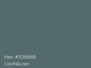 Hex #536b6b Color is a normal cyan color and the nearest color is Stormcloud #4f666a. Hex code #536b6b and RGB value is rgb(83,107,107). In RGB color space, this color is composed of 33% red, 42% green, 42% blue, In CMYK color space, this color is composed of 22% cyan, 0% magenta, 0% yellow , 58% black , In HSL color space, this color has a hue angle of 180° , 13% saturation and 37% lightness.