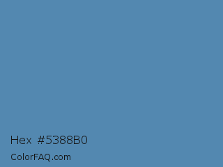Hex #5388b0 Color is a normal blue color and the nearest color is Cyan Azure #4e82b4. Hex code #5388b0 and RGB value is rgb(83,136,176). In RGB color space, this color is composed of 33% red, 53% green, 69% blue, In CMYK color space, this color is composed of 53% cyan, 23% magenta, 0% yellow , 31% black , In HSL color space, this color has a hue angle of 206° , 37% saturation and 51% lightness.