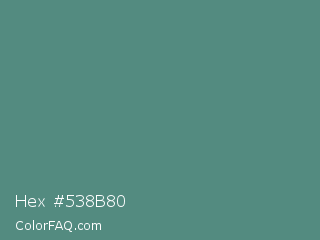 Hex #538b80 Color is a normal cyan color and the nearest color is Wintergreen Dream #56887d. Hex code #538b80 and RGB value is rgb(83,139,128). In RGB color space, this color is composed of 33% red, 55% green, 50% blue, In CMYK color space, this color is composed of 40% cyan, 0% magenta, 8% yellow , 45% black , In HSL color space, this color has a hue angle of 168° , 25% saturation and 44% lightness.