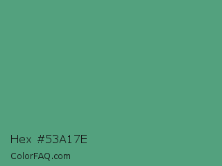 Hex #53a17e Color is a normal green color and the nearest color is Shiny Shamrock #5fa778. Hex code #53a17e and RGB value is rgb(83,161,126). In RGB color space, this color is composed of 33% red, 63% green, 49% blue, In CMYK color space, this color is composed of 48% cyan, 0% magenta, 22% yellow , 37% black , In HSL color space, this color has a hue angle of 153° , 32% saturation and 48% lightness.