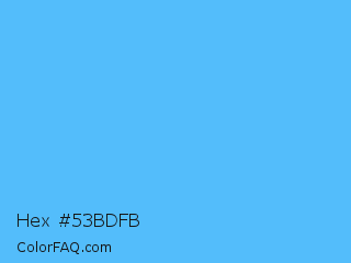 Hex #53bdfb Color is a light blue color and the nearest color is Blue Jeans #5dadec. Hex code #53bdfb and RGB value is rgb(83,189,251). In RGB color space, this color is composed of 33% red, 74% green, 98% blue, In CMYK color space, this color is composed of 67% cyan, 25% magenta, 0% yellow , 2% black , In HSL color space, this color has a hue angle of 202° , 95% saturation and 65% lightness.