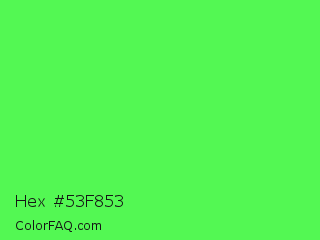 Hex #53f853 Color is a light green color and the nearest color is Screamin Green #66ff66. Hex code #53f853 and RGB value is rgb(83,248,83). In RGB color space, this color is composed of 33% red, 97% green, 33% blue, In CMYK color space, this color is composed of 67% cyan, 0% magenta, 67% yellow , 3% black , In HSL color space, this color has a hue angle of 120° , 92% saturation and 65% lightness.