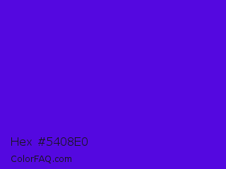 Hex #5408e0 Color is a normal violet color and the nearest color is Han Purple #5218fa. Hex code #5408e0 and RGB value is rgb(84,8,224). In RGB color space, this color is composed of 33% red, 3% green, 88% blue, In CMYK color space, this color is composed of 63% cyan, 96% magenta, 0% yellow , 12% black , In HSL color space, this color has a hue angle of 261° , 93% saturation and 45% lightness.
