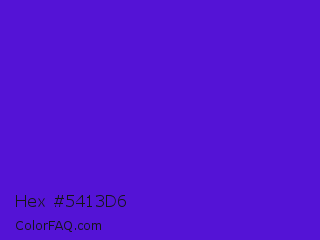 Hex #5413d6 Color is a normal indigo color and the nearest color is Interdimensional Blue #360ccc. Hex code #5413d6 and RGB value is rgb(84,19,214). In RGB color space, this color is composed of 33% red, 7% green, 84% blue, In CMYK color space, this color is composed of 61% cyan, 91% magenta, 0% yellow , 16% black , In HSL color space, this color has a hue angle of 260° , 84% saturation and 46% lightness.