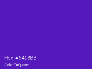 Hex #5418bb Color is a normal violet color and the nearest color is Purple Heart Crayola #652dc1. Hex code #5418bb and RGB value is rgb(84,24,187). In RGB color space, this color is composed of 33% red, 9% green, 73% blue, In CMYK color space, this color is composed of 55% cyan, 87% magenta, 0% yellow , 27% black , In HSL color space, this color has a hue angle of 262° , 77% saturation and 41% lightness.
